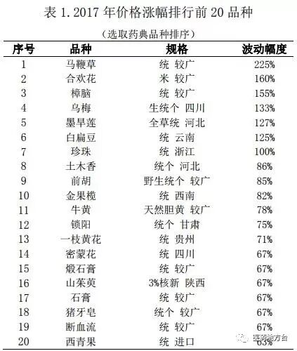 2017年,我国中药材流通市场常见的741个中药材流通品种中,220个品种价格上涨,比2016年的237个减少17个。其中价格涨幅排名前20的药品,平均涨价幅度达到101%。